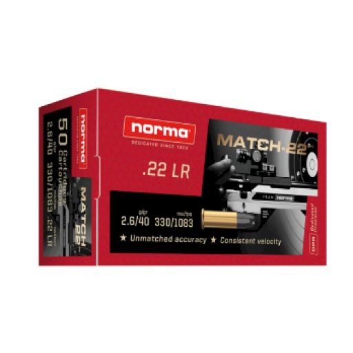 La munition NORMA Match-22 est une munition de match de qualité supérieure pour les tireurs exigeants. Elle est équipée d'une balle en plomb à tête plate (RN), pesant 40 grains, pour une vitesse initiale de 1 080 pieds par seconde. La balle en plomb à tête plate offre une précision exceptionnelle et une trajectoire stable pour des tirs précis à longue distance.