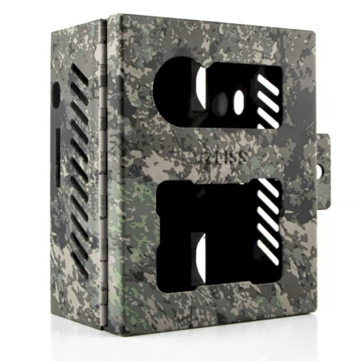 Le boîtier robuste enveloppe entièrement la caméra, sans en compromettre les fonctionnalités. Les découpes sont parfaitement alignées avec l’objectif, les capteurs et les LED de la ZEISS Secacam 7, garantissant un fonctionnement optimal. Le motif camouflage sur l’ensemble de la surface permet une intégration discrète dans l’environnement naturel.