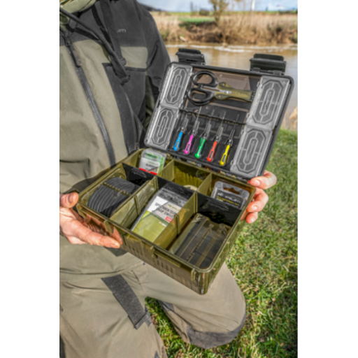BLOX est un nouveau concept de rangement pour matériel de pêche, conçu spécialement pour les pêcheurs polyvalents. Il permet de ranger tout votre matériel dans un seul et même espace parfaitement organisé. Les dimensions de BLOX ont été soigneusement étudiées pour accueillir les indispensables accessoires de montage, comme les bobines de fil, les paquets d'hameçons et autres accessoires. Vous pouvez utiliser le compartiment BITS BLOX dédié si vous préférez des compartiments, ou encore ranger vos bas de ligne dans le couvercle. Vos outils d'amorçage et vos ciseaux se rangent facilement, et le compartiment principal est modulable grâce à des séparateurs. Si vous le souhaitez, vous pouvez également y ranger votre RIG BLOX, pour protéger vos bas de ligne pré-montés des intempéries. Une seule boîte pour tout faire ! • Construction robuste • Joint d'étanchéité • La boîte à pêche la mieux organisée du marché - 196 mm (P) x 250 mm (L) x 91 mm (H)