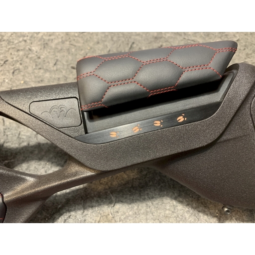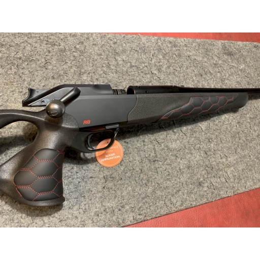 Carabine Blaser R8 ultimate cuir custom cal 300wm busc et devant avec surpiqures en nid d'abeille rouge.