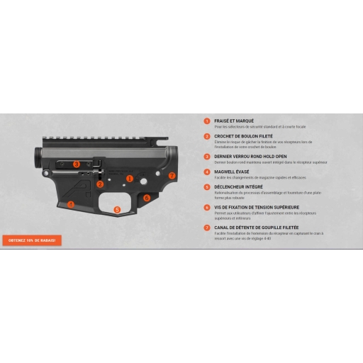 L'ensemble récepteur EPC-9 d'Aero Precision est usiné avec précision à partir de deux pièces forgées en aluminium 7075-T6 et dispose d'un système de maintien en position ouverte de la dernière cartouche. Cet ensemble EPC-9 est compatible avec les chargeurs Glock à cadre standard et accepte le 9x19 ou le .40S&W en utilisant la combinaison porte-boulon, canon et chargeur appropriée.