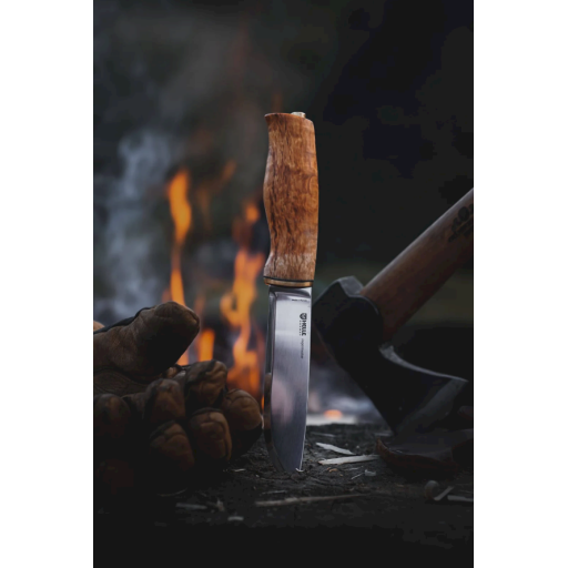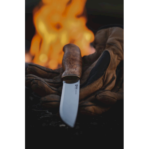 La plaque frontale en laiton protège l'une des plus grandes lames de la gamme Helle. La lame en acier 12C27 possède un profil légèrement convexe, ce qui lui permet de glisser facilement dans les matériaux tendres.