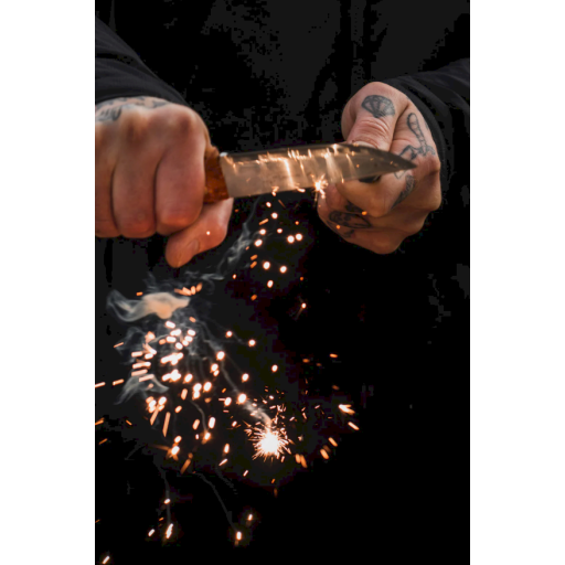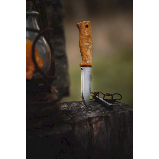 Le manche est doté d'une partie centrale robuste assurant une bonne prise en main et d'un repose-doigts solide pour protéger l'utilisateur. La lame, de grande taille, possède un affûtage scandinave classique qui confère une grande puissance à chaque mouvement du couteau.