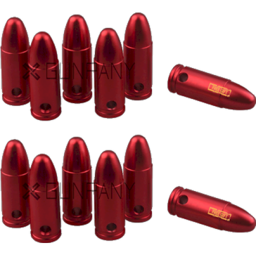 Ces cartouches factices 9 mm sont concues pour imiter parfaitement une munition reelle sans contenir de poudre, d amorce ni de projectile. Fabriquees en alliage d aluminium avec une finition anodisee rouge, elles sont ideales pour l entrainement, les tests, la manipulation ou le stockage en toute securite. Chaque cartouche est equipee d un culot en silicone souple pour proteger le percuteur lors des tirs a sec. Pack pratique de 12 pieces (10+2).