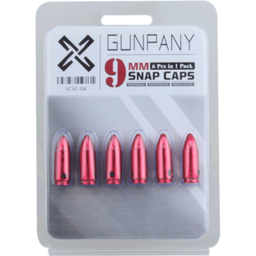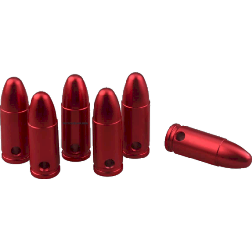Ces cartouches factices 9 mm reproduisent fidelement les dimensions d une munition reelle sans contenir de poudre, d amorce ni de projectile. Fabriquees en alliage d aluminium avec une finition anodisee rouge, elles sont concues pour l entrainement, les tests, le stockage et la manipulation en toute securite. Le culot en silicone souple protege efficacement le percuteur lors des tirs a sec. Lot pratique de 6 pieces avec attache incluse.