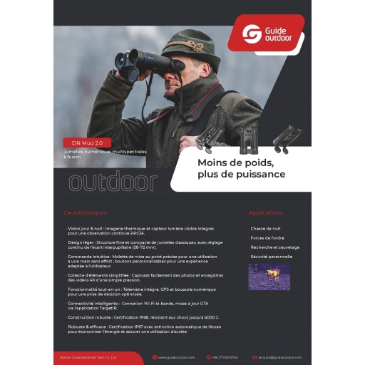 La série DN Muo 2.0 inaugure une nouvelle génération de jumelles numériques tout temps, conçues pour la chasse, la sécurité et les missions professionnelles. Grâce à la fusion intelligente entre imagerie thermique et lumière visible, le DN70M 2.0 offre une restitution d’image d’une grande précision, même dans les environnements les plus difficiles.