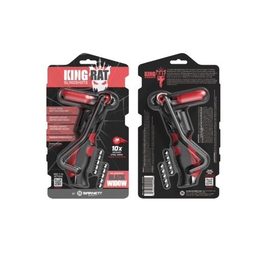 Le design qui a changé les lance-pierres pour toujours. Le lance-pierre à fronde Black Widow a introduit l'armature de poignet pliable pour faciliter la portabilité et le stockage.