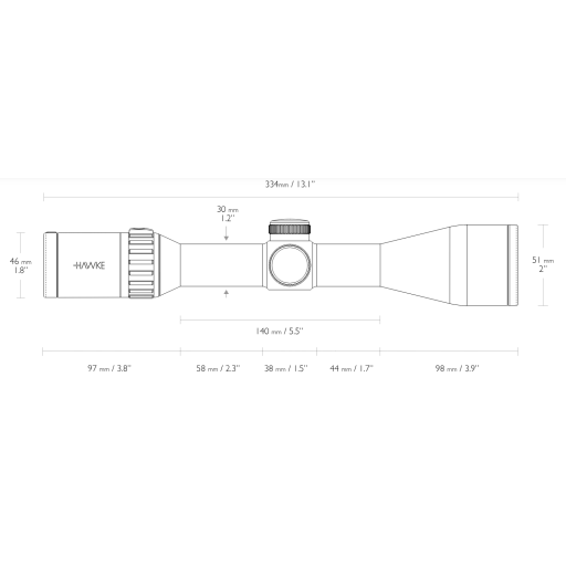 Des points de visée supplémentaires sont inclus sur la tige inférieure fine pour une meilleure graduation et une meilleure précision lors des tirs à longue distance. Le réticule LR2 FD est la deuxième génération de réticules LR Dot de Hawke. Il bénéficie de sous-tensions de point de visée et d'un BDC améliorés pour s'adapter aux cartouches à percussion centrale et aux vitesses initiales modernes.