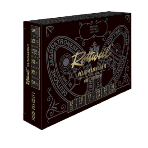 La munition Rottweil Waidmannsheil HV à douille plastique se distingue par une vitesse particulièrement élevée de la gerbe. HV est l'abréviation de l'anglais High Velocity (haute vitesse).