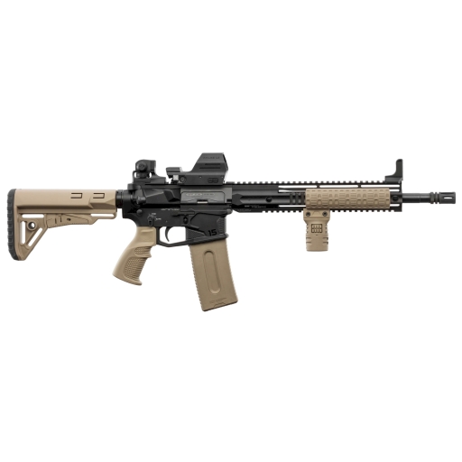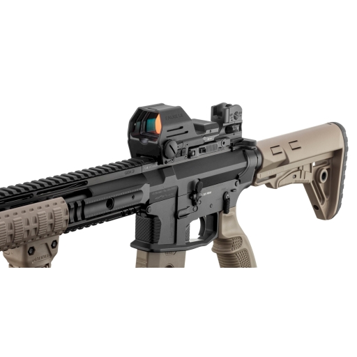 L’arme principale est dotée d’un canon de 14,5 pouces avec un cache-flamme type A2, d’un garde-main quad-rail Picatinny de 12 pouces, et d’un kit de sélecteurs offrant plus de 25 configurations. Elle intègre une crosse télescopique CCS avec fixations QD, deux chargeurs de 10 coups, et un départ réglable entre 1,5 et 2,5 kg. Elle est complétée par un red dot FALKE LE QL Gen 2, robuste et précis, pour une acquisition rapide des cibles.