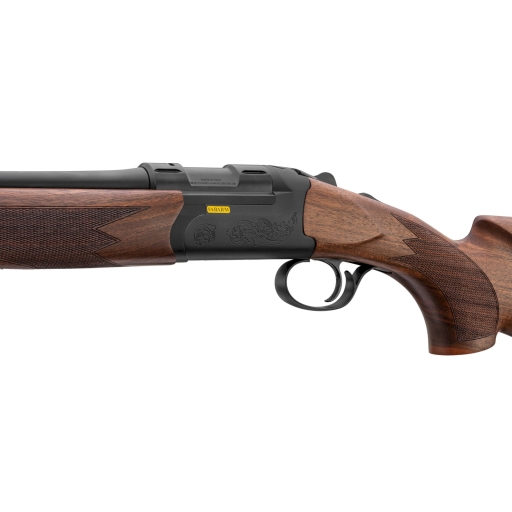 Une carabine express dont l’élégance tient autant à sa magnifique finition noire satinée qu'à ses écussons d’un jaune éclatant qu’aux parfaites proportions de sa bascule. La gravure avec de larges et belles volutes est profonde afin de créer un fort contraste. Le mécanisme est à extracteur, facilitant ainsi la récolte des étuis vides.