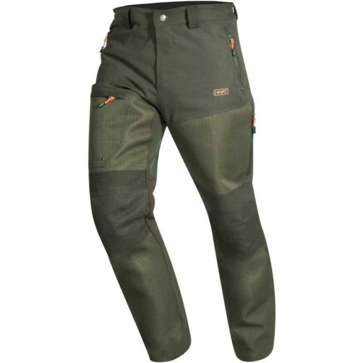 Pantalon imperméable extra renforcé, pour chasse au gros gibier. En résistant tissu Ripstop avec double couche à l’intérieur, pour une plus grande protection contre les ronces. Pièces spéciales de renfort BLINTEX aux genoux pour une protection supplémentaire. Pièces élastiques à l’entrejambe et derrière les genoux, pour une plus grande liberté de mouvement. 5 poches : 2 poches à l’avant zippées, 1 poche cargo zippée sur hanche, 1 poche pour couteau et 1 poche arrière zippée. 2 fermetures éclair d’aération à l’arrière. Haute imperméabilité (8.000 mm) et respirabilité (5.000 g/m2). Bretelles HART Velcro amovibles comprises. Couleurs : Blaze, Vert.