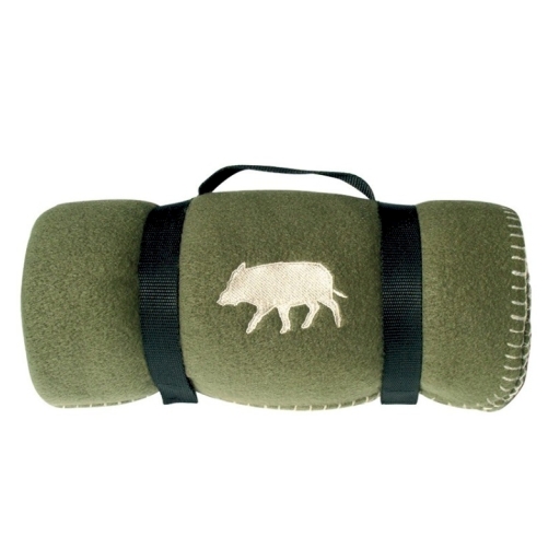 Ce plaid polaire, brodé à l’effigie du sanglier est le compagnon indispensable des parties de chasse hivernales.